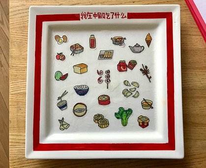 En pensant à une idée pour mon oeuvre rétrospective, j'ai essayé trouver quelque chose qui m'avait particulièrement marqué depuis notre arrivée en Chine. J'ai tout de suite pensé à la nourriture. Je prenais souvent des photos de ce qu'on mangeait, alors j'ai décidé de les utiliser comme inspiration pour faire des petits dessins que je collerais ensuite sur une assiette.